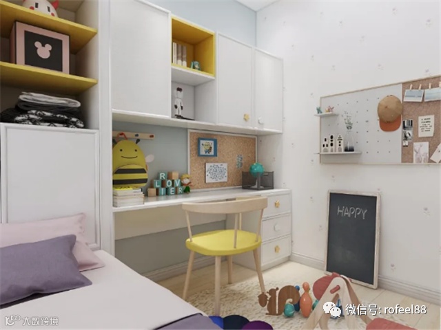 第二款儿童房是由主卧改造而成的,为了解决家里卧室不够住的问题,屋主决定把主卧一分为二改成了儿童房和老人房,儿童房位于父母房和老人房的中间,日后孩子独立睡觉,也比较方便照看。设计师将书桌和榻榻米床沿墙呈L型摆放,留出大片玩乐区,铺上地毯,摆放一些玩具。这里就是小可爱的快乐制造厂,玩腻了还能在旁边在黑板墙上涂涂画画,童年十分惬意!