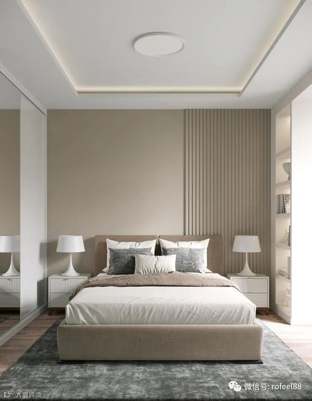 卧室拥有开阔的视野,线性的背景墙装饰,色彩的选择也更加的深邃静谧,让人在这里可以更加的放松自己。
