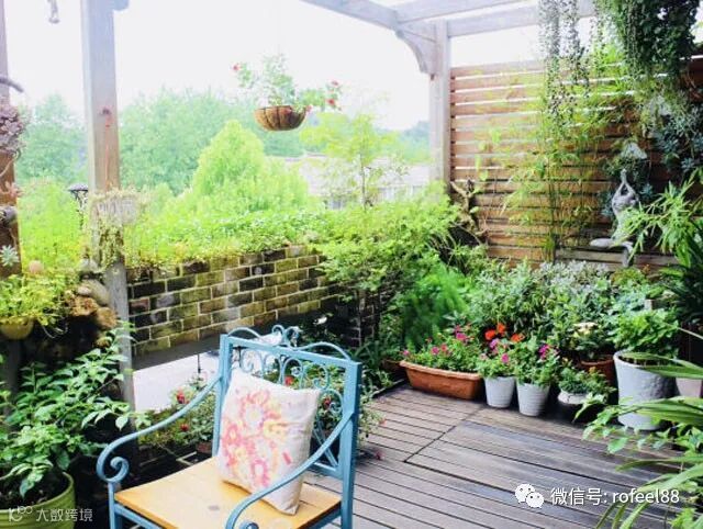 空间再大一点的话,就可以考虑做些小小的造景,周围铺上石材、营造庭院园林景色,并做个花架供藤蔓植物攀爬,摆上垂坠植物,创造高低植栽的层次感,让景观更显丰富。