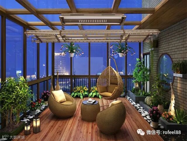 阳台上铺着木质地板,搭配着藤条编制的靠椅,四周种满绿植,外围玻璃环绕,顶上也是由玻璃制成的,视野是极好,坐在这里聊聊人生,抬头看看星空及远方,一整天烦闷的心情也得以舒缓。