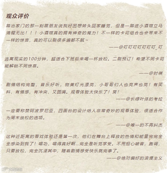 在过去的两年里,除了上海的驻演外,它还开设了成都、长沙、广州等地的分馆。由于有着足够的关注度,广州站开票当天不到8个小时,首轮12场的演出票就被抢空,可以说延续了上海的火爆。