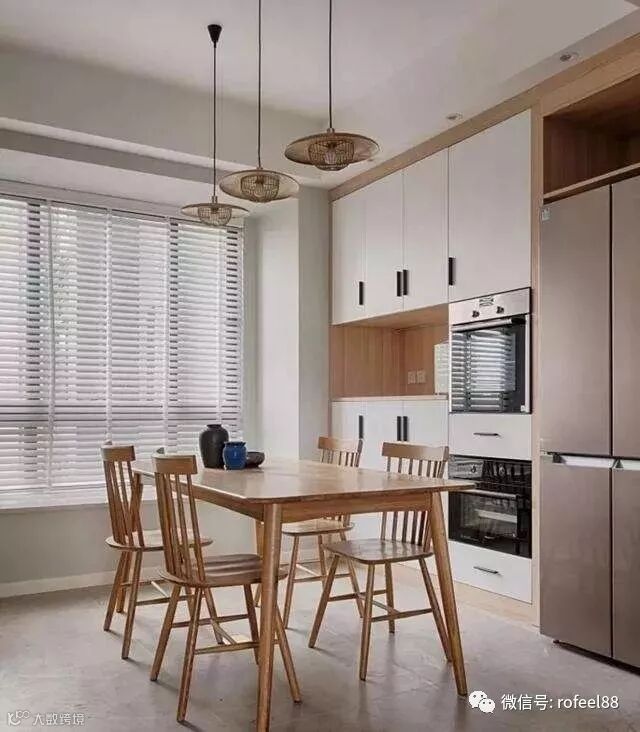餐边柜还可以与电冰箱做组合设计,结合上到顶的顶柜,这种满墙设计,客厅的收纳空间可以瞬间放大。