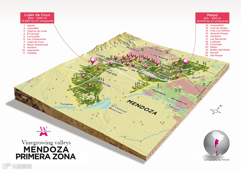另一部分葡萄园位于卢汉德库约(Luján de Cuyo)的子产区佩德列尔(Perdriel),维斯塔拉巴(Vistalba)和阿格列罗(Agrelo)以及迈普(Maipú)的Medrano(坐落在起伏的Lunlunta山)。