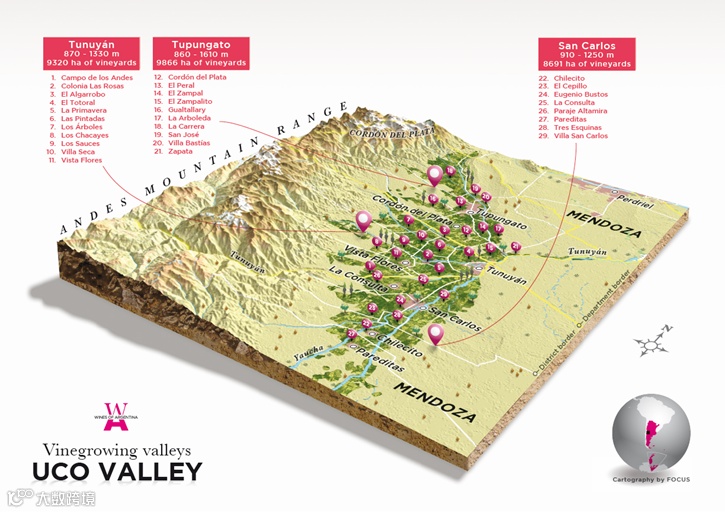 一部分的葡萄园位于优克谷(Uco Valley)—— 子产区图蓬加托的胡塔拉利(Gualtallary);子产区图努扬(Tunuyán)的维斯塔·弗罗莱斯(Vista Flores)、查卡耶斯(Chacayes)和阿尔伯雷斯(Los Árboles);以及子产区圣卡洛斯(San Carlos)的拉孔苏尔塔(La Consulta)和阿塔米拉(Altamira)。