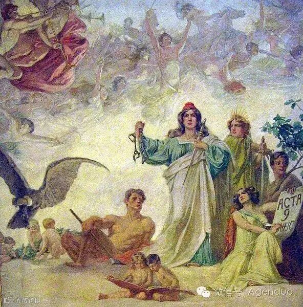 1816 年 7 月 9 日,阿根廷宣布独立。图为阿根廷总统府(Casa Rosada)天花板上的壁画《阿根廷独立》(Independencia Argentina),由画家 Luis de Servi 创作,以寓言神话的形式描绘着阿根廷独立的故事。