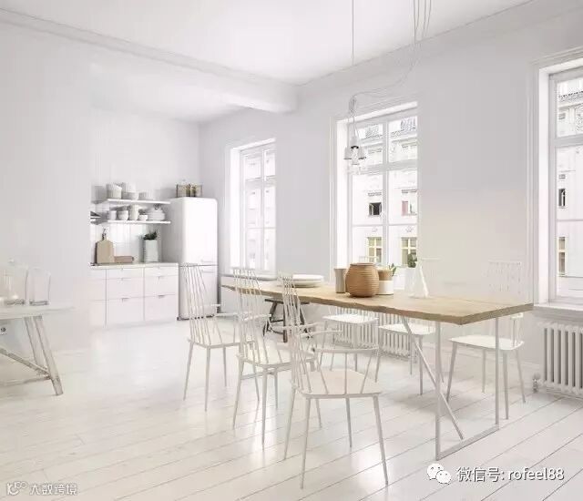 北欧风格在处理空间方面一般强调室内空间宽敞、内外通透,最大限度引入自然光。在空间平面设计中追求流畅感;墙面、地面、顶棚以及家具陈设乃至灯具器皿等,均以简洁的造型、纯洁的质地、精细的工艺为其特征。