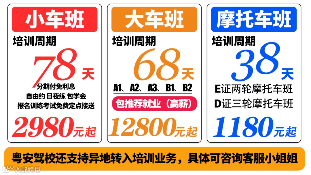 24所训练场遍布全广州市,全国百强驾校,实体自营场地,超过600台教练车,拥有一支专业优秀的教练员团队,还配有专门的接送大巴车免费定点接送,白天晚上均可练车,包学会!