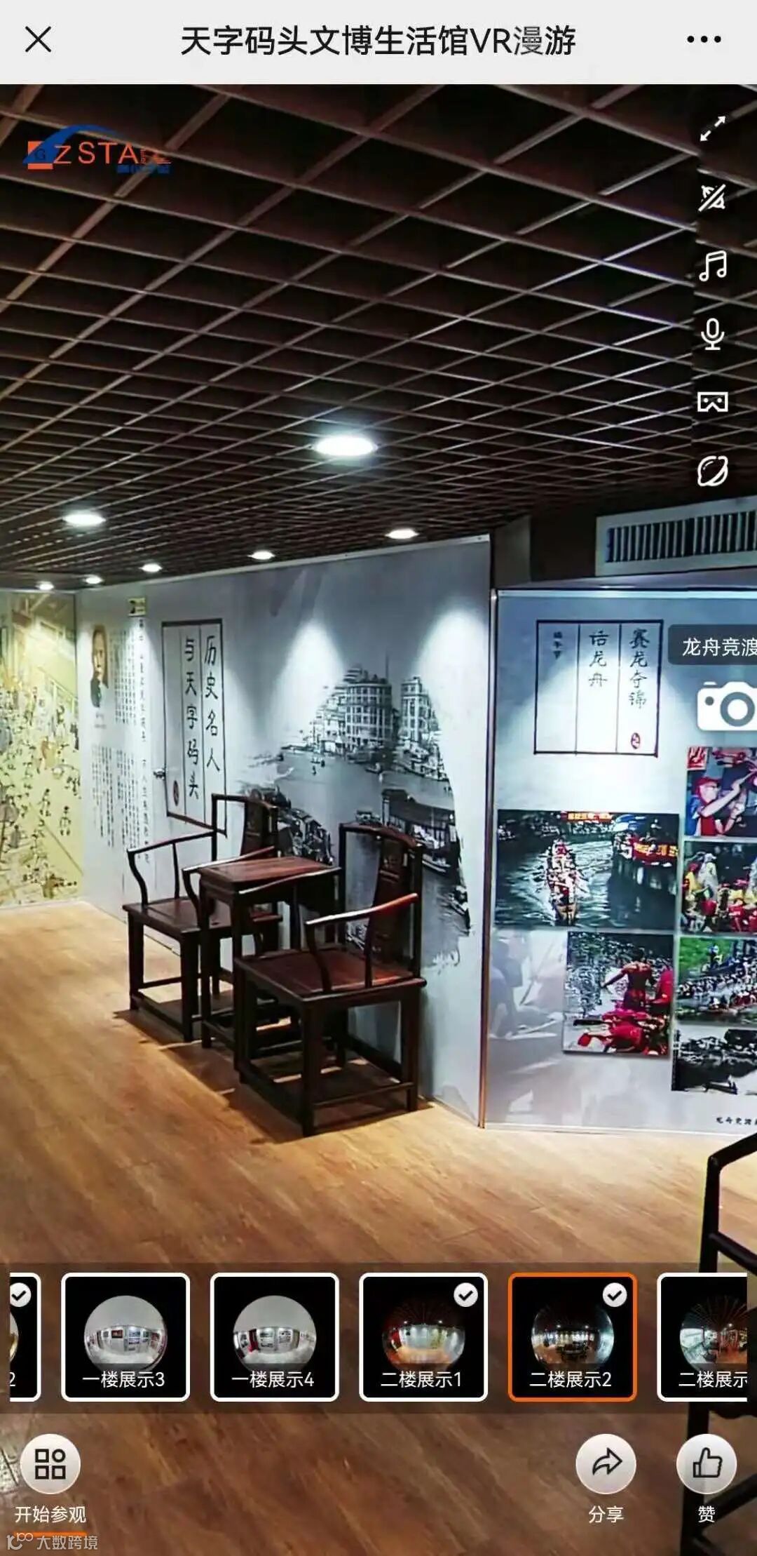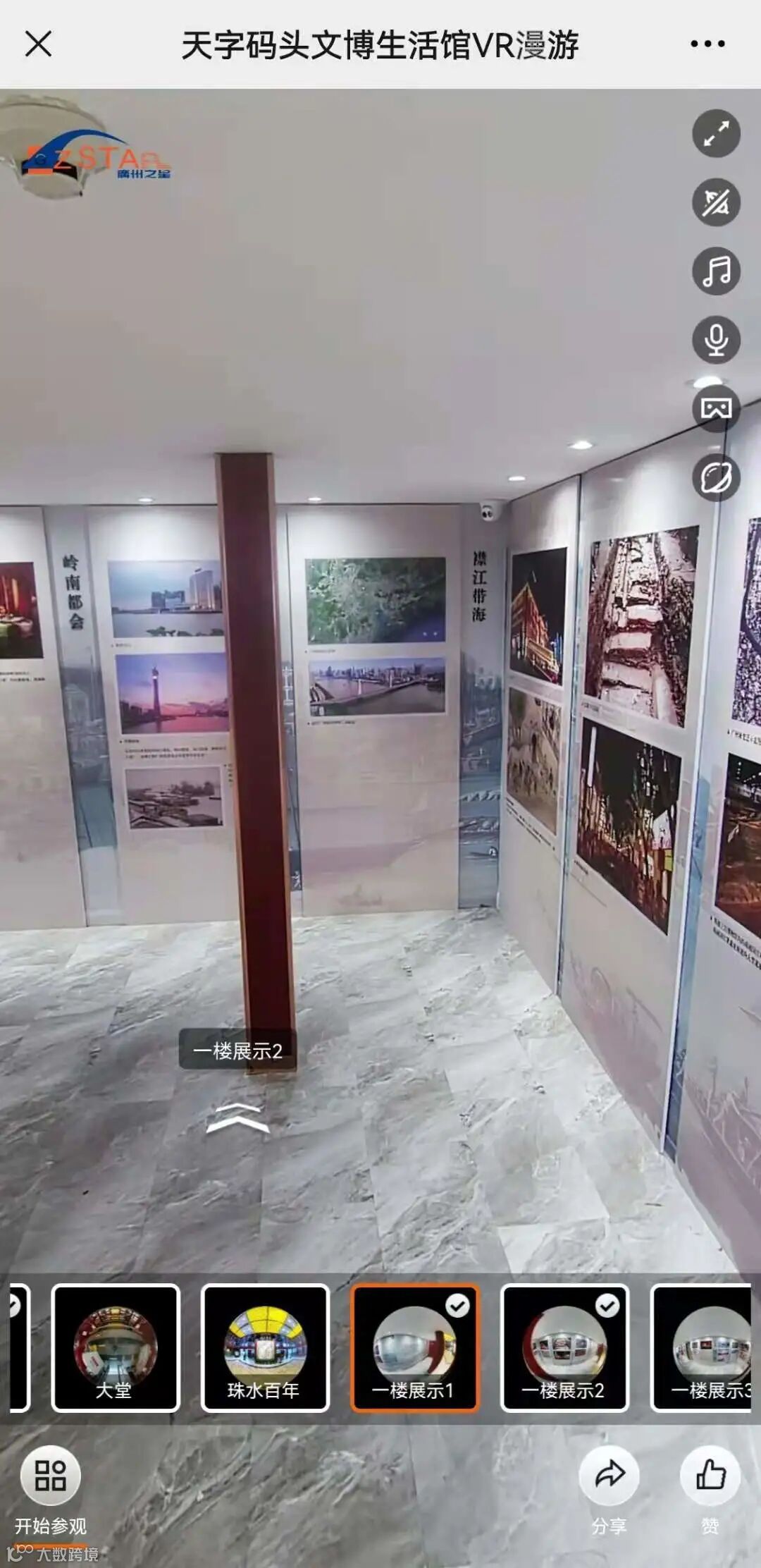 关注“天字码头珠江夜游”微信公众号→进入主页点击中间跳转按钮“珠水百年”→点击“VR漫游文博生活馆”