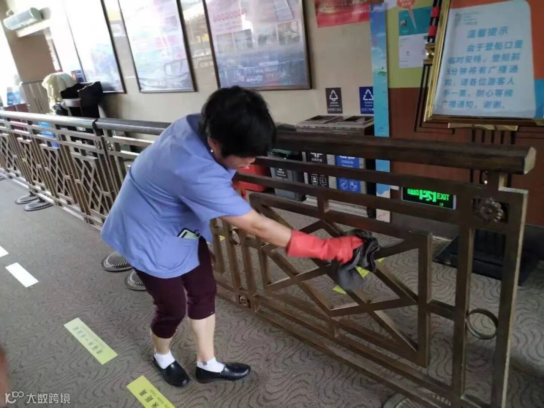 码头、船舶每日加强卫生消毒,包括安检口、候船厅、检票口、卫生间、售票区域、船舶客舱等公共部位。安检口、检票口、乘客座椅、栏杆、扶手、卫生间等人员可直接接触部位增加消毒频次。