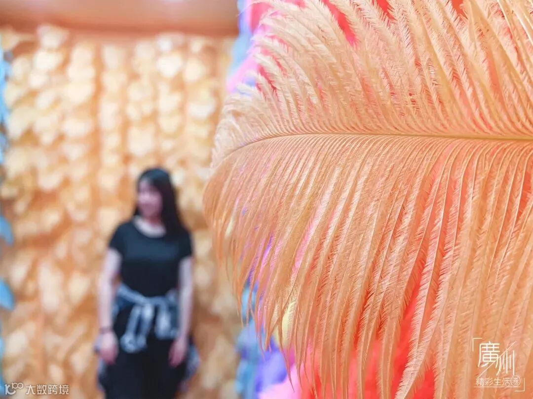 3张铺满五颜六色羽毛的巨大墙面,一进屋就有种置身七彩云朵的幻觉,只想赶紧扑进柔软的羽毛中。