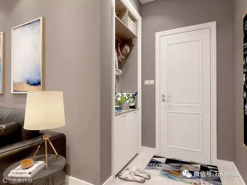 进门玄关处,上下不对称的玄关柜设计,大面积的置物格以及挂钩设计,收纳装饰两不耽误。