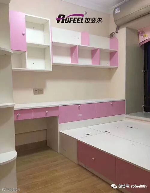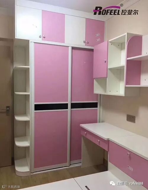 粉色系是女孩子们的主题色,这款粉红色衣柜+书柜和延伸出来的床头柜,将小小的房间变得宽敞整洁,让零零碎碎的物品各有其位,让一切看起来都那么舒适自然。