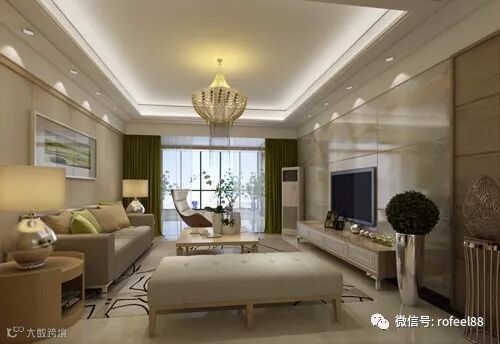 通过客厅中心的梁,使天花板高度看起来降低不少,在中间使用圆形或方形升高造型,并且搭配一盏吸睛的主灯,把缺陷变成空间优势。此外,还可以利用梁体做格状划分,巧妙将梁包装为极有设计感且不压迫的天花造型。