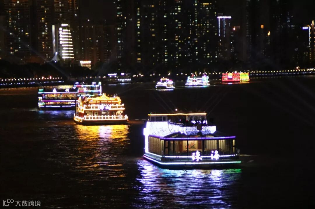 本次花船巡游表演,天字码头共有4艘豪华游船参与。其中广州财富号作为“大湾区城市群”代表,领航信息时报号(东莞)、广百号(珠海)、广发证券号(中山)等11艘豪华游船畅游珠江,向全国市民展示大湾区城市群的魅力。