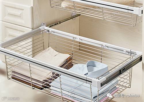衣柜中最常见的便是活动拉篮的运用,活动拉篮使取放更方便,可以根据实际需要装配不同大小的拉篮。拉篮中适合放T恤、衬衫、毛衣等衣物。