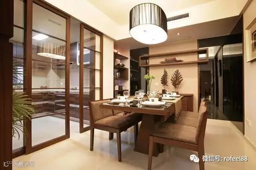 厨房算得上是一个频繁使用玻璃隔断墙的空间,通常厨房与餐厅相连,但因为厨房中在炒菜煮饭过程中会制造各种油烟,为了避免这些混合的刺激气味飘散到餐厅,甚至遍布整个家居空间,通常会使用玻璃隔断墙进行阻隔。炒菜时将玻璃门合拢避免气味外泄,平时玻璃门敞开增大居室开放空间。厨房中的玻璃隔断墙一般会选择有花纹等图案的可开合式推门,既美观又实用。