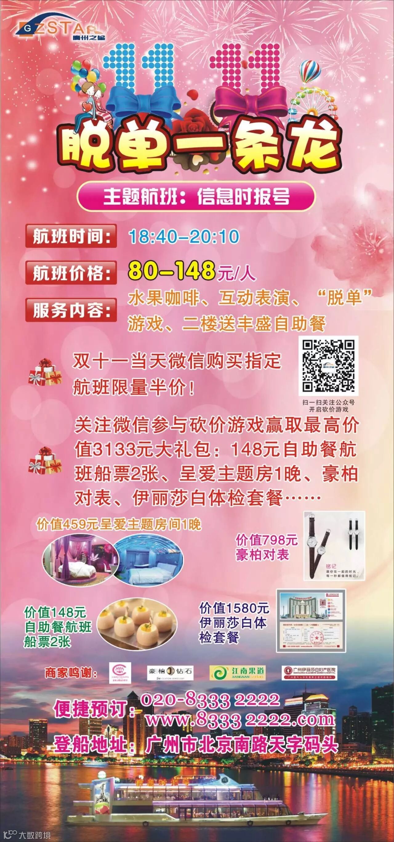 11月11日当天,微信在线购买天字、广州塔、海心沙、大元帅府码头80-100元航班,全部享半价优惠!