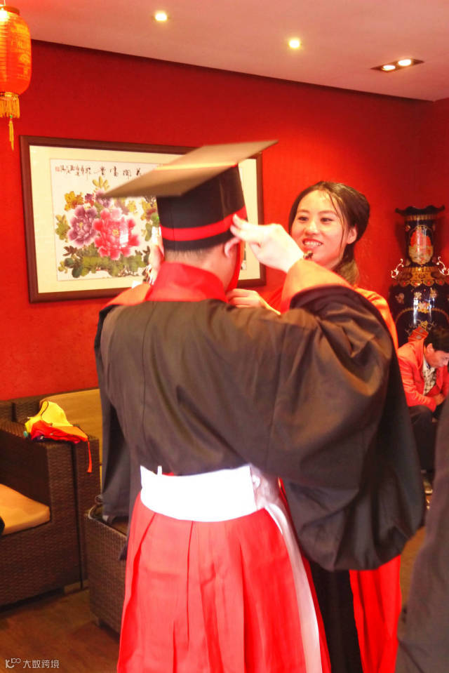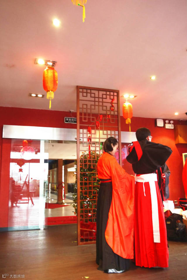 在整理汉服,一丝不苟