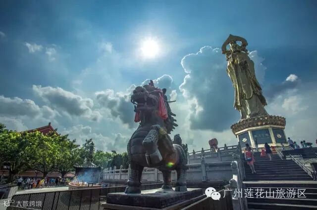 番禺莲花山位于珠江口狮子洋畔,是国家AAAA级旅游区、广东省省级风景名胜区,先后被评为国家重点文物保护单位、新世纪羊城八景之一——莲峰观海。莲花山上,粗犷而又不失秀美的莲花石居中,左有远古洪荒时海水冲蚀形成的狮子石,右有南越先民采石而成的白象岩。40.88米高的望海观音宝像坐落于莲峰之巅,霞披狮海,光泽南天;宝像碑文“引慈航以庇桑梓,施甘露而润粟榆,保居者安,护行者顺,佑善者昌,启愚者蒙,普众生缘开因果,渡信士普结菩提”记述了观音菩萨普渡众生的要义。