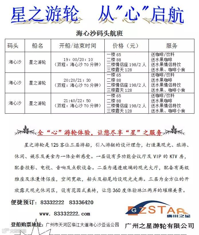 天字码头、海心沙码头都有停靠,满足两个景区市民的需求!在北京路逛完街或者在花城广场感受后亚运风采之后,都可步行来到两个码头,乘搭星之游轮,领略它的风采!