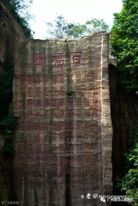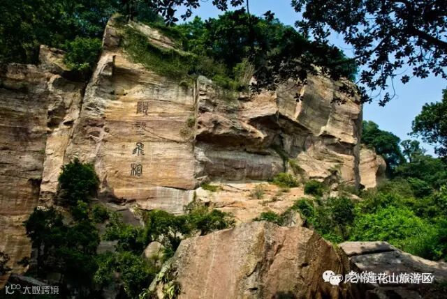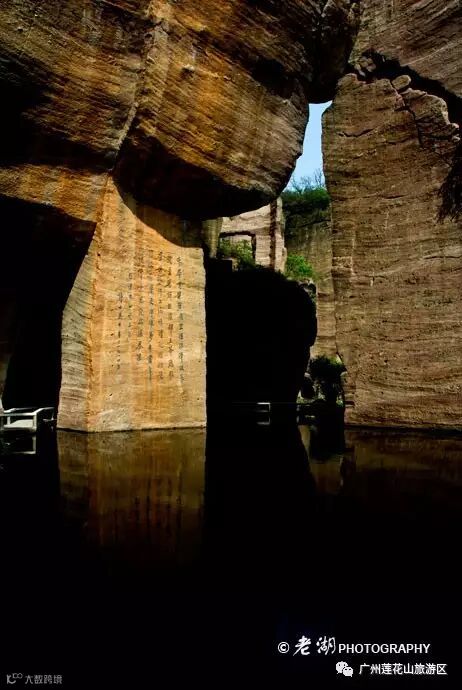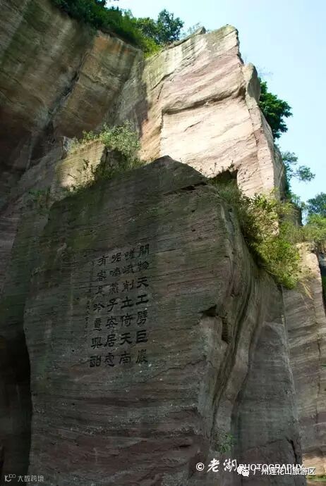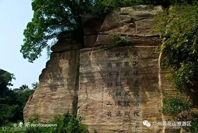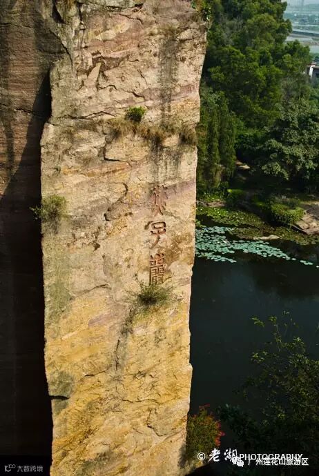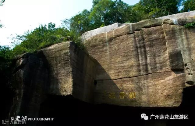 岩底的一块石壁上,刻着“莲花山古采石场遗址”九个字。这个1983年中国科学院副院长、我国著名考古学家夏鼐来莲花山考察时题的字。当时莲花山古采石场最早开采于哪个年代也无法考证,夏鼐考察南越王彩画石室墓之后,认为莲花山采石场“不迟于宋”,于是在石壁上题为“古采石场”。