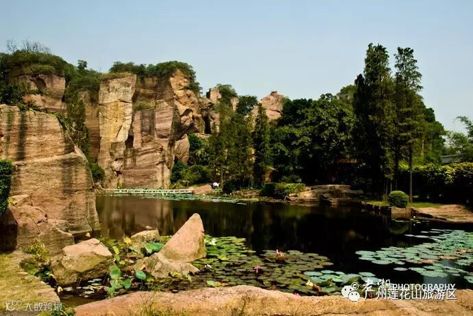 莲花山采石场的遗址建有很多水池、水塘,都是古代采石坑积水形成的,里面都种植有莲花,碧绿的水色映着巨大的石壁,相得益彰。