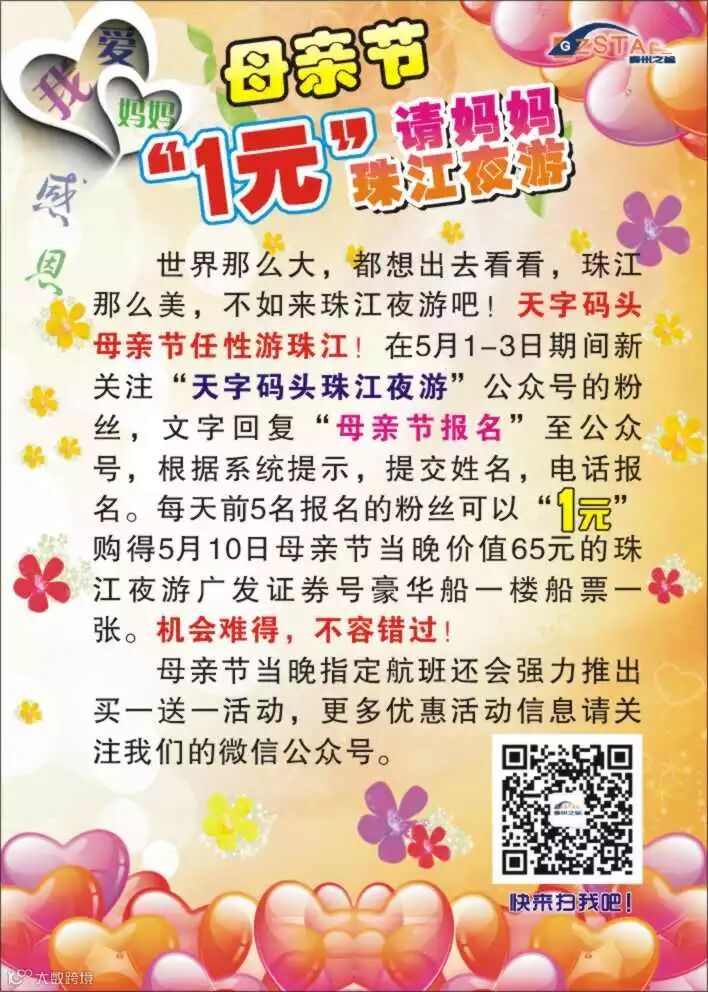 世界那么大,都想出去看看,珠江那么美,不如来珠江夜游吧!天字码头母亲节任性游珠江!在5月1-3日期间新关注“天字码头珠江夜游”公众号的粉丝,文字回复"母亲节报名"至公众号,根据系统提示,提交姓名,电话报名。每天前5名报名的粉丝可以“1元”购得5月10日母亲节当晚价值65元的珠江夜游豪华船票一张。