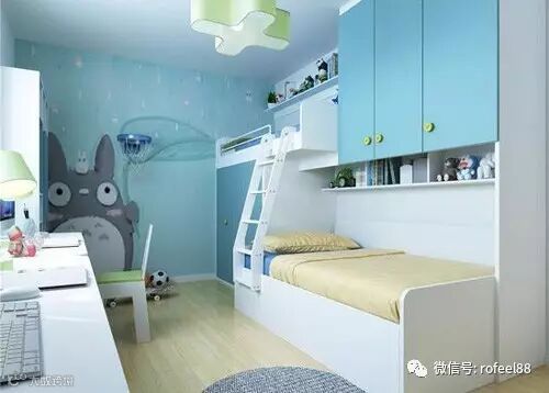 年幼的孩子总是特别喜欢卡通,对他们来说卡通主题的儿童房非常的有吸引力。蓝色背景的墙面上不仅有白云,还有可爱的龙猫,五角星做装饰灯,可爱又梦幻。