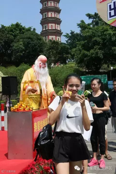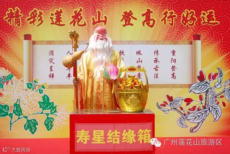莲花山贵为观音清凉地,为重阳登高祈福理想之所,因防火需要,也是番禺区唯一的重阳登高点。为传承传统习俗,祝愿国泰民安、人寿年丰,莲花山旅游区准备六万份登高好运香囊,于国庆节、重阳节期间由象征健康长寿的南极寿星向排队的游客免费赠送散发脉脉清香的好运香囊。