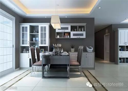 餐边柜搭配吊柜和餐桌椅,形成简约温馨的用餐空间。餐边柜带玻璃门,防尘效果更佳,台面可操作,还可放置餐盘和调味瓶。