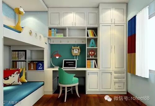 上下床布局的儿童房,实现二胎家庭的空间需求难题,实现了二孩各得其位,休息、学习、储物皆得其所。在色调上,选用水湖蓝和象牙白两色,清新自然,温馨浪漫。