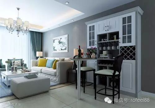 在客厅沙发一侧设计了吧台,提倡一种精致的生活方式,同时起到了隔断作用。