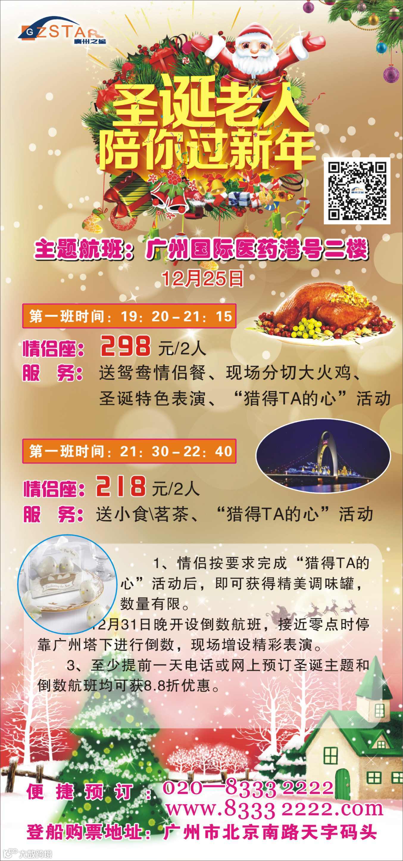 当然还不止这些!圣诞过后就是跨年倒数的大日子了,天字码头照例会推出倒数主题航班,接近零点时游船停靠在广州塔下一同进行灯光倒数。在游船上欣赏着美丽的江景,挥动起手中的荧光棒,跟随着广州塔的节奏一起倒数跨过14进入崭新的一年!心动了吗?天字码头圣诞老人约定你,陪你一起过新年!