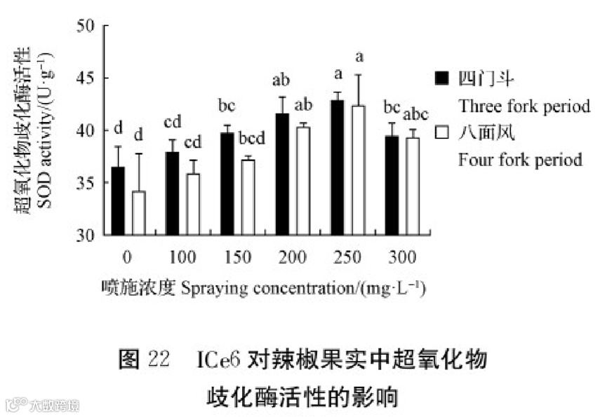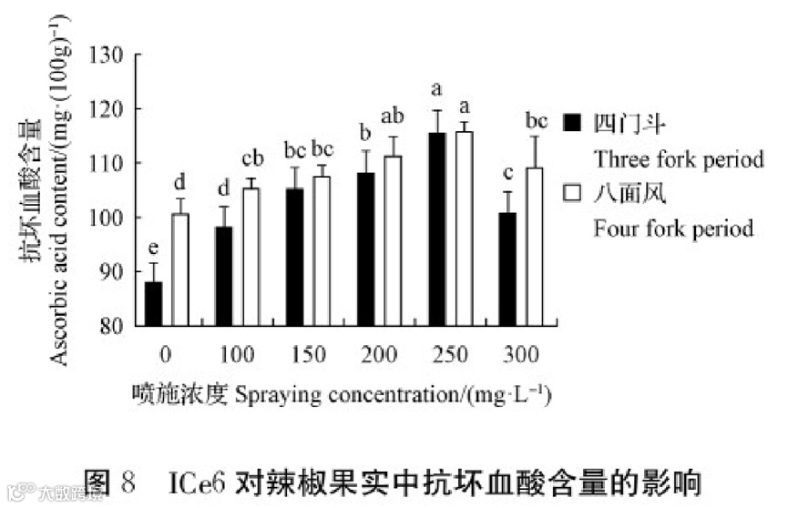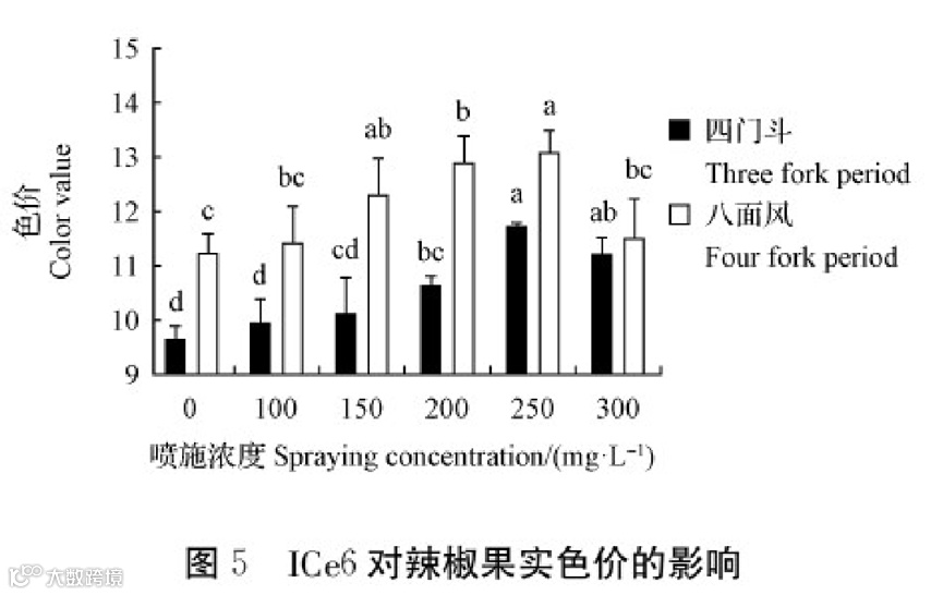 由图5可知,在喷施不同浓度ICe6下均显著提高了辣椒果实色价。