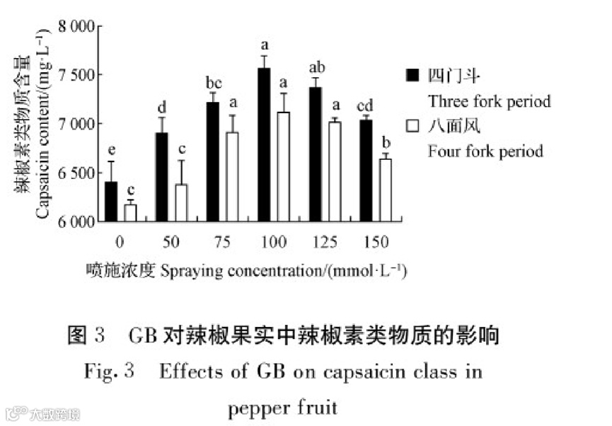 由图3可知,在喷施不同浓度GB下均显著提高了辣椒果实辣椒素类物质含量。