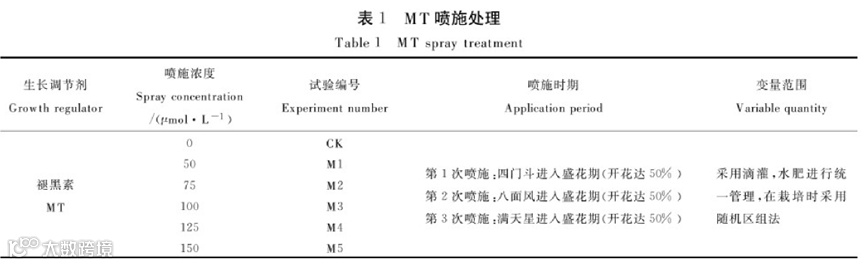 试验设置单因素五水平,采用随机区组法,每小区面积为4m株,行距为30cmX45cm,每穴双株栽培。每个处理重复3次。褪黑素设置5个浓度梯度,选取3个不相连、相近的小区。喷施时期与浓度梯度见表1〜3。