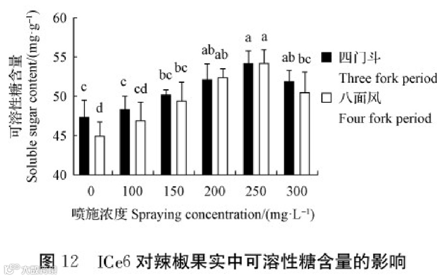 可溶性糖:二氢卟吩铁(ICe6)的提升效果最为突出,“八面风”时期最高增幅达19.42%,“四门斗”时期最高增幅为14.36%,可有效中和辣椒辛辣味,优化果实口感;