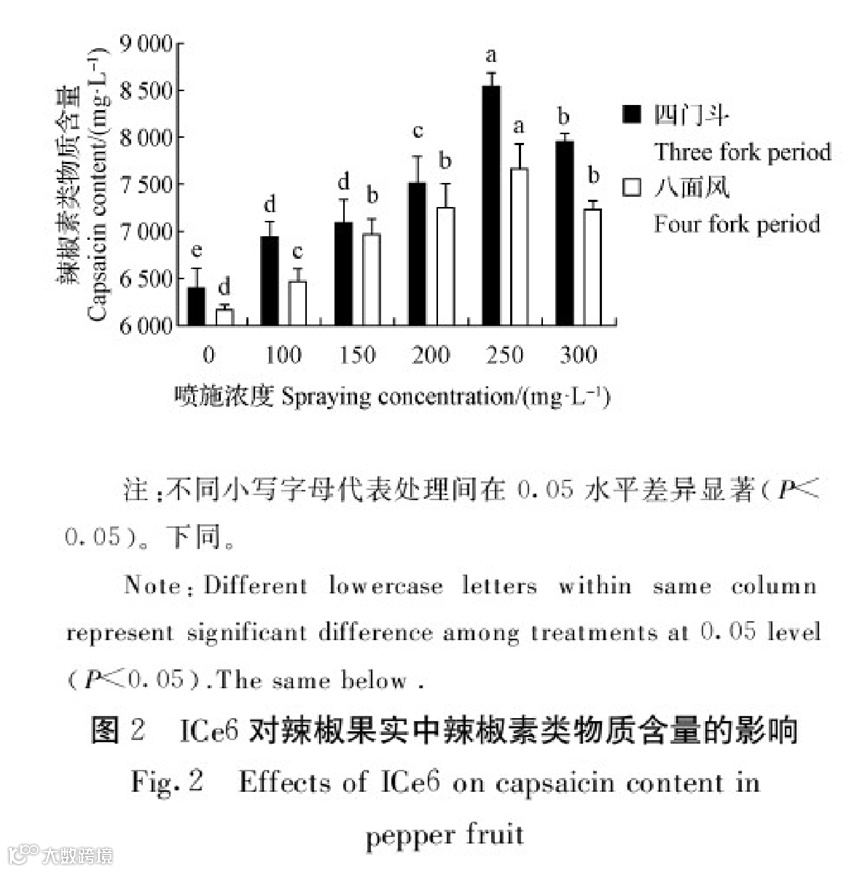 由图2可知,在喷施不同浓度ICe6下均显著提高了辣椒果实辣椒素类物质含量。