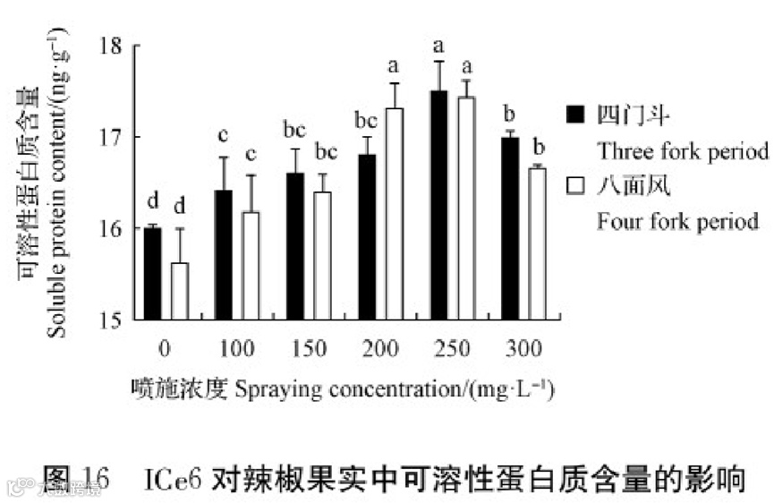 可溶性蛋白质:二氢卟吩铁(ICe6)与甜菜碱(GB)的调控效果更优,最高增幅分别达11.57%、11.11%,进一步丰富辣椒果实的营养组分。