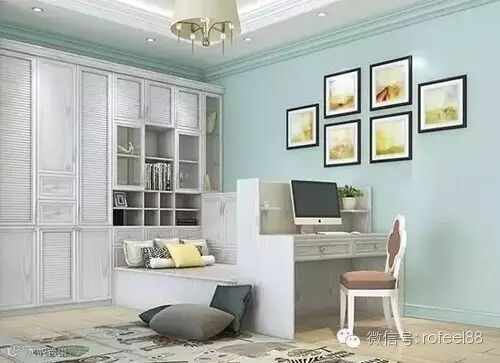 ▲欧式的优雅体现在每一个细节上,掩门柜以百叶作点缀,没有繁复的线条,在榻榻米一侧再巧妙地搭出一方书桌,“夹缝重生”的读书空间更显难得。