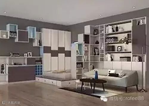 ▲客厅一侧或室内某处空间设会客区,两侧墙面铺以储物柜,可作书柜或储物柜,中部为榻榻米空间,凸起空间满足会客时存放茶具或零食的需求,平时还可作收纳用。