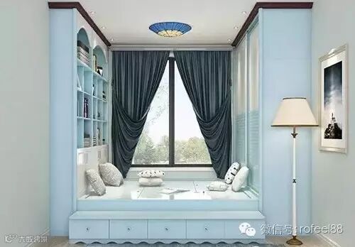 ▲蓝色是最冷的颜色,但纯净,透着美丽、冷静、理智、安详与广阔。于窗前设上翻榻榻米床,左右两边以掩门衣柜与半开放式储物柜“夹击”,蓝色系空间显实用明净。