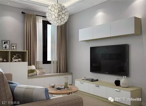 客厅的飘窗不一定是独立分开来的,还可以与电视柜连成一体。这样的话,看起来好像客厅三面都环上了小矮柜一样,整体风格达到了最大限度的统一,转角的一小片空间都利用上了,还能提升客厅的格调。