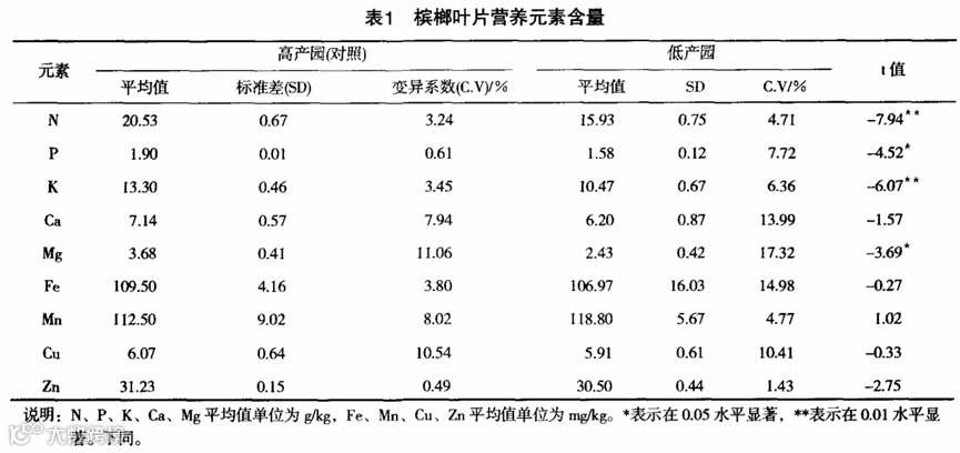 为了拿到精准数据,此研究专门对比检测了高产槟榔园和低产槟榔园的叶片营养元素含量,涵盖氮、磷、钾、钙、镁等大量元素,以及铁、锰、铜、锌等微量元素,结果差异十分明显。