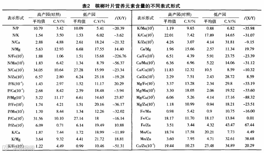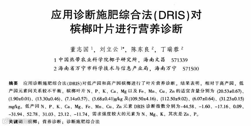 文案 | 来源 董志国,刘立云,陈东良,等. 应用诊断施肥综合法(DRIS)对槟榔叶片进行营养诊断[J]. 热带作物学报,2010,31(3):361-364.