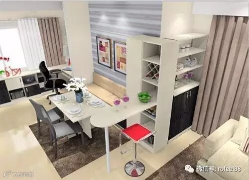 餐边柜带吧台的组合设计很有创意,也让空间的柜体看上去非常地完整,而且也很实用。隔断的餐边柜带吧台的组合也是现代家装的流行区域,新颖别致,还具有隔断空间的作用。