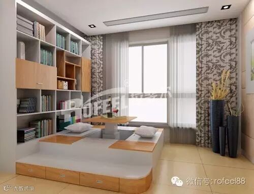 在客厅里做一个大大的榻榻米,用来接待亲朋好友,榻榻米的一边是是衣柜用来收纳衣物,一边是书架用来摆放书籍或装饰物。