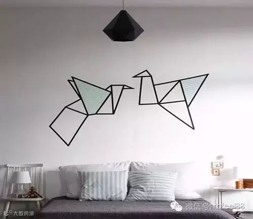 不敢拿整面墙当试验品,就用简单的小图案来练练手,照样能体验手绘的乐趣。两只纸鹤仿佛盘旋于床头之上,勾勒的几何线条与几何形吊灯相呼应,别有一番情趣。