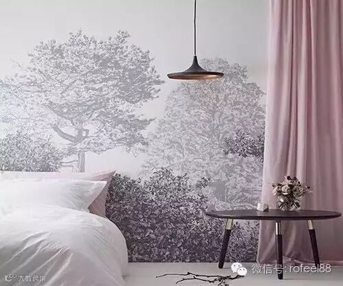 卧室的墙面,选择手绘一幅静谧的图画,有助于睡眠。如图中淡淡的水墨色画,与洁白的床上用品和粉色的窗帘相融合,营造了一份文艺气息。