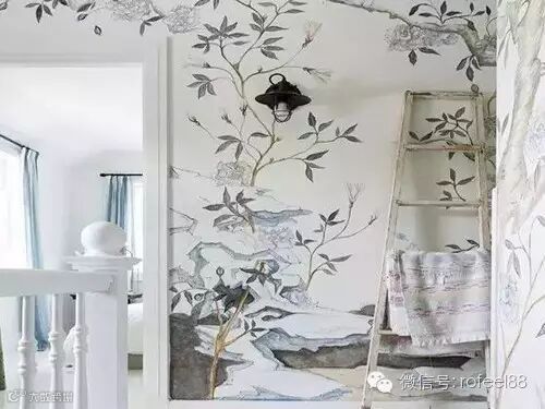 花草枝叶的手绘墙很常见,可以临摹,也可以自由发挥。黑色灯帽的灯具和木梯点缀其中,使得整面墙更加富有趣味,十分生动。